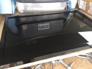入口横にはコンパネをアルミ複合板でサンドイッチし、アルミ製フレームで製作した本体を、お客様に艶ありブラックに塗装して頂き、シルバーのシートで製作したロゴを施工です。