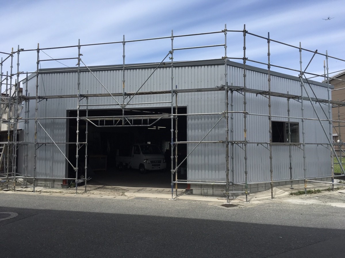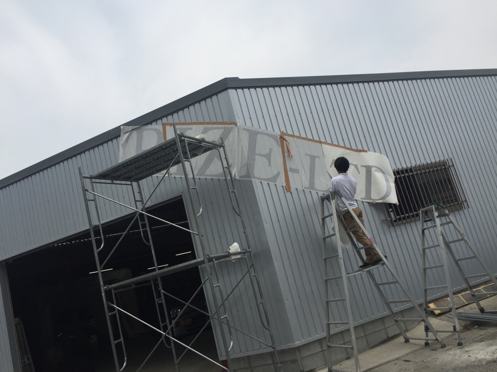 板金塗装のRIZEさんの増築工場にサインを施工しました。今回は四角い看板からの脱却〜。
