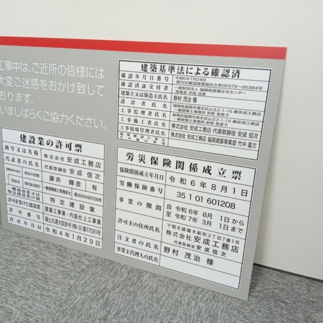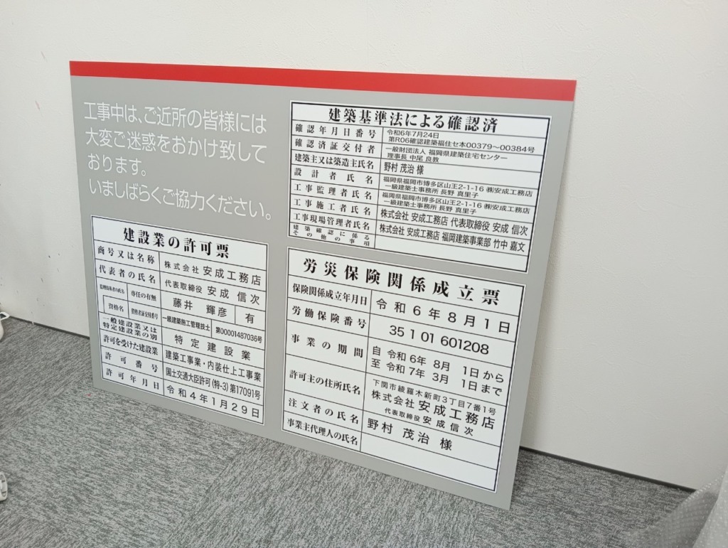 今回の看板は、現場の安全性と情報提供を重視したデザインで、建設業許可や労災保険の掲示内容が明瞭に示されています。素材には耐久性の高いアルミ複合板を使用し、インクジェット出力シートによる鮮やかな印刷を施しました。