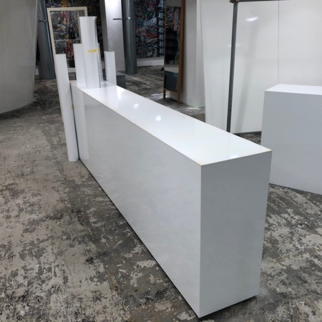 お客様の㈲サンコウ技建様からのご依頼に基づき、白を基調としたスタイリッシュな什器に、シートを用いて高品質な仕上がりを実現。什器の表面を光沢のあるシートで覆うことで、清潔感のあるモダンなデザインとなりました。