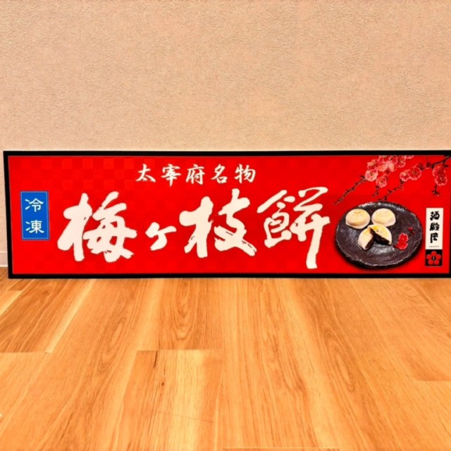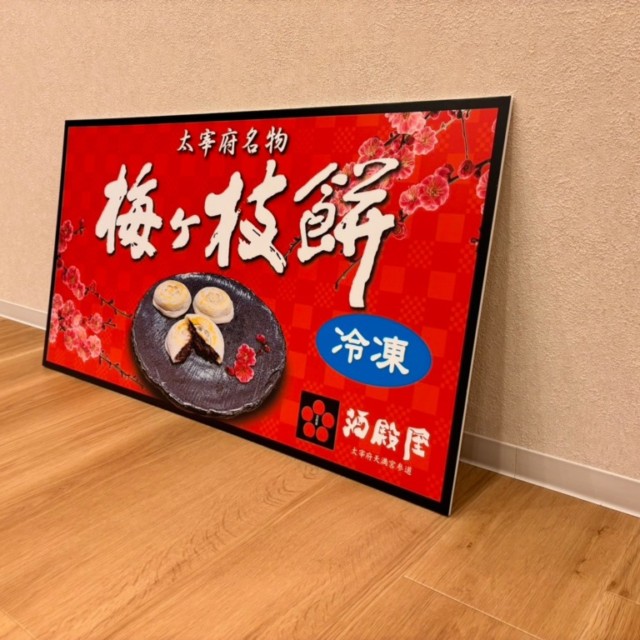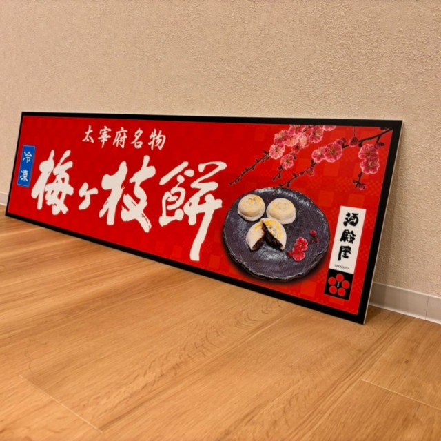 写真でご覧いただける通り、このパネルは太宰府名物「梅ヶ枝餅」をテーマにしたデザインで、商品の魅力を最大限に引き出すために、細部までこだわり抜かれた仕上がりとなっております。赤を基調とした背景に、梅の花のイラストが美しく配置され、商品名が大きく表示されており、一目で内容が伝わるデザインです。