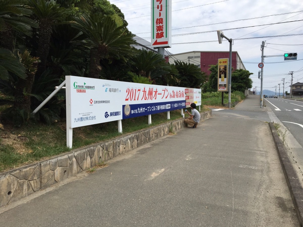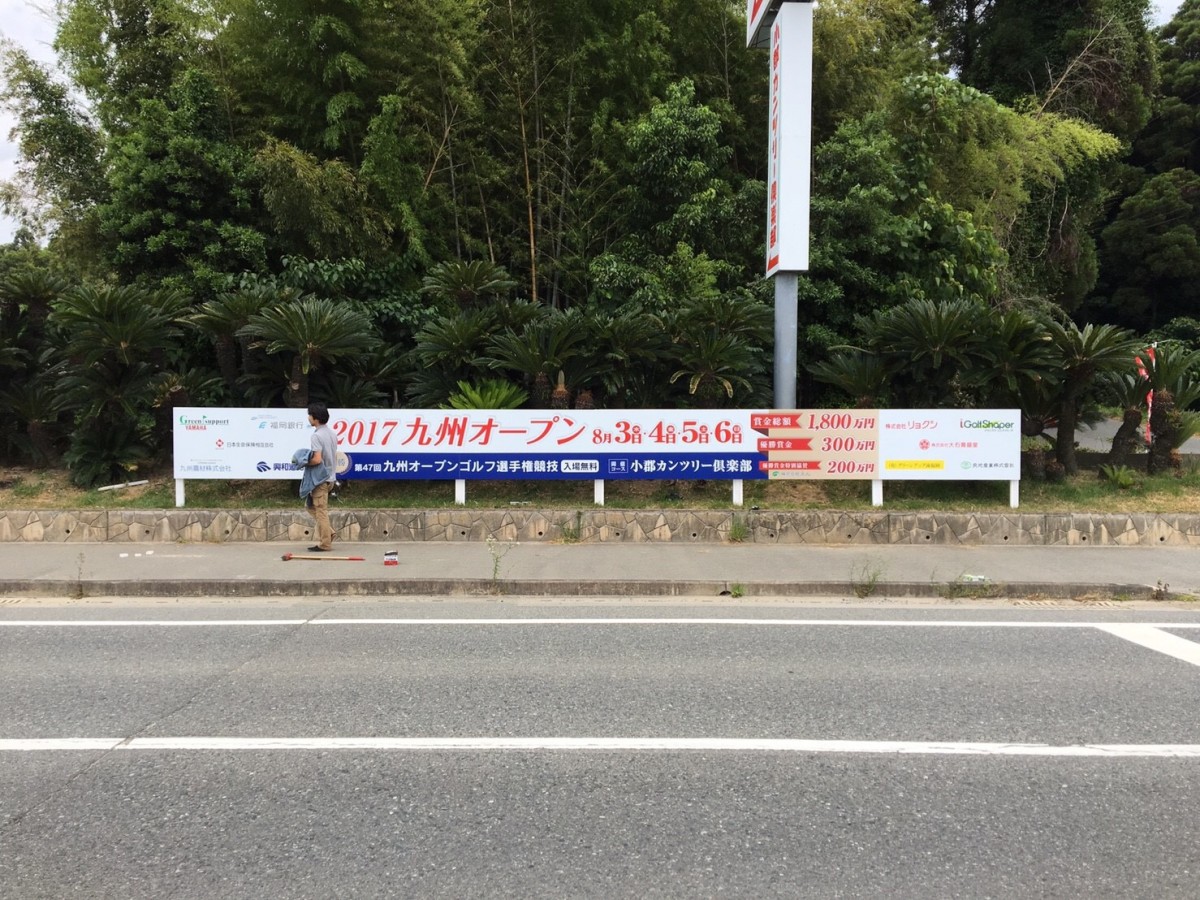 小郡カンツリー倶楽部様 九州オープン選手権サイン WORKS DETAIL お客様名 小郡カンツリー倶楽部 施工場所 業種 ゴルフ場 カテゴリー 自立看板/野立看板ゴルフ場内表示板 竣工年月 2017年6月 九州オープンゴルフ選手権の告知看板設置です。 アルミ複合板にインクジェット出力、木枠フレーム。 10mと20mの看板です。 また開催に向けて色々なサインを製作していきます!