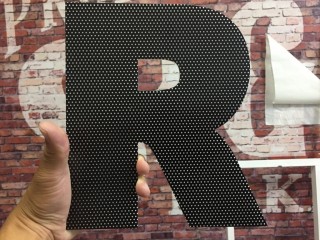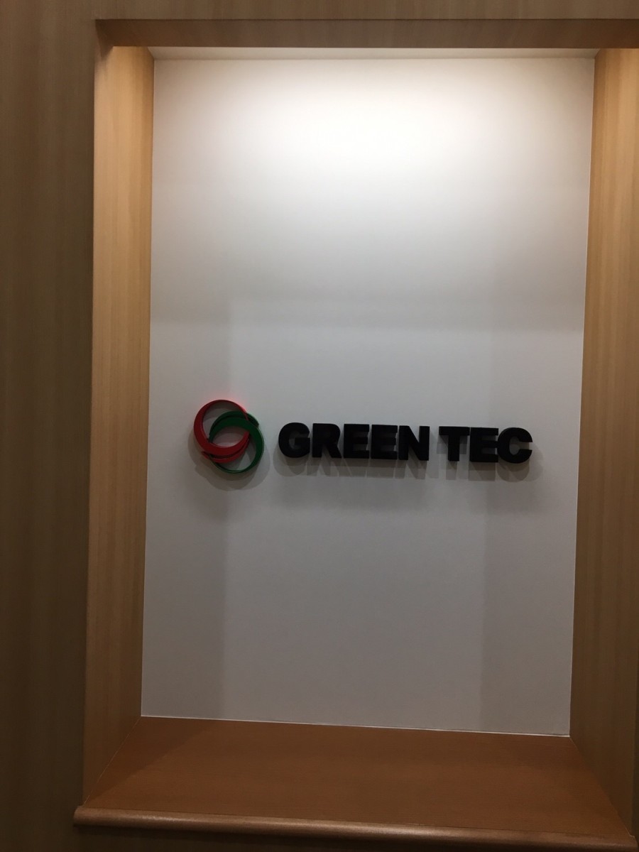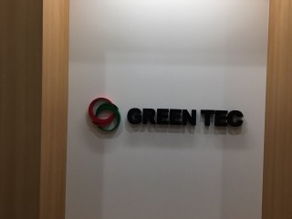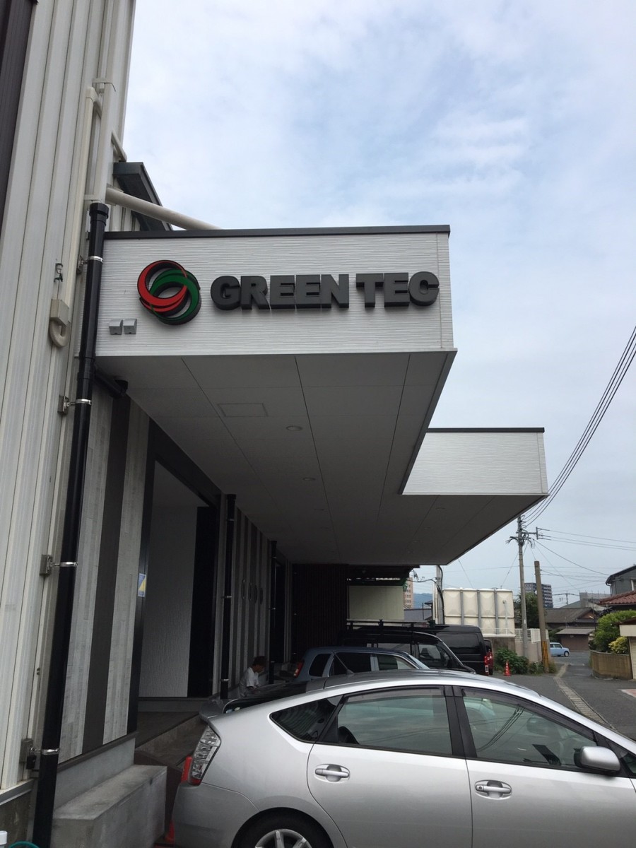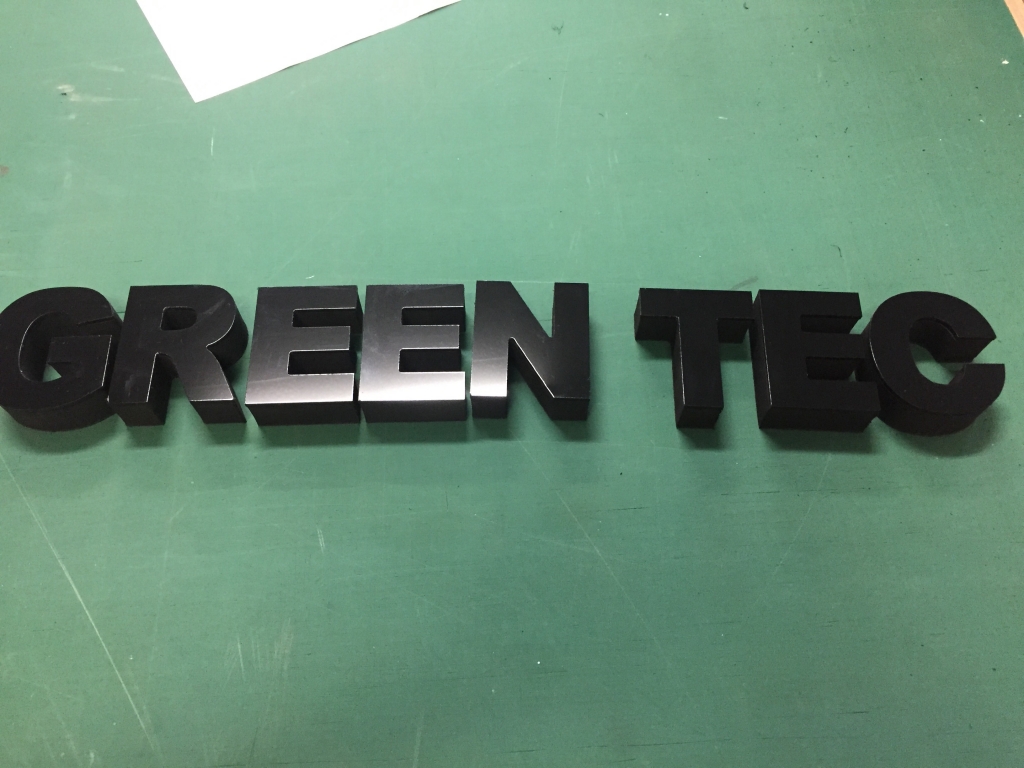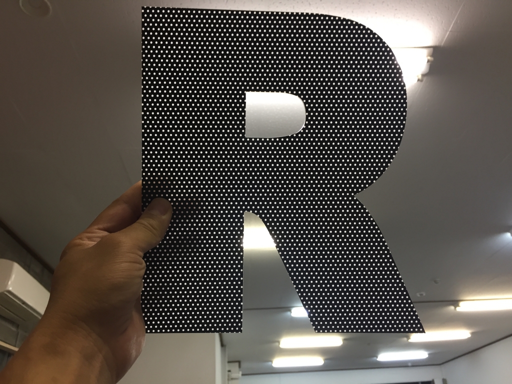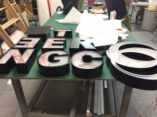 チャンネル文字は、LED正面発光。ロゴは赤と緑の電照用シート、英字部分はデュアルカラーシート(昼は黒色、光ると白色に見えます)