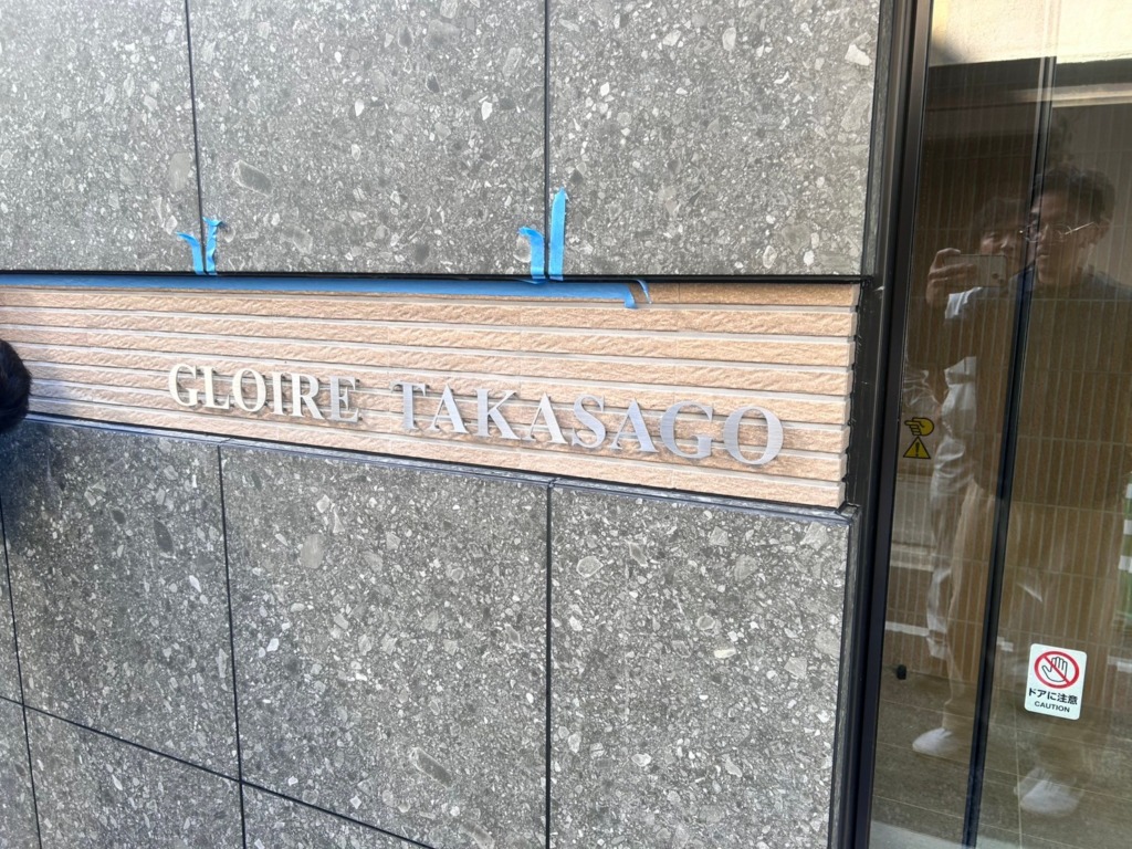 エントランス部分の館銘板には、ヘアライン仕上げのステンレス切り文字を採用しました。10mmの浮かし施工を施すことで、立体感と陰影の美しさを演出し、シンプルながらも高級感のあるデザインに仕上げています。ステンレス素材は耐久性・耐候性に優れており、長期間美しい状態を維持できる点も大きな特徴です。また、エントランス横のコンクリートウォールには、建物のデザインに調和するブラック仕上げのステンレス切り文字を配置し、落ち着いた雰囲気の中でしっかりと視認性を確保しました。