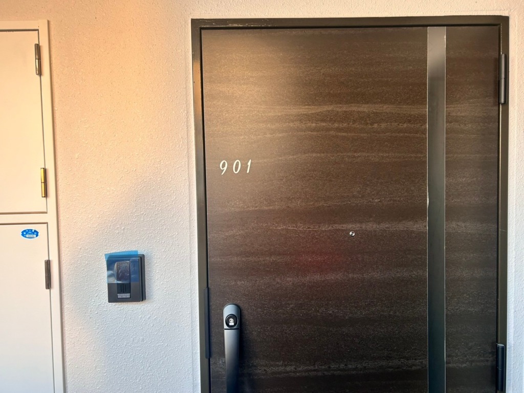 住戸番号は、シンプルで見やすいカッティングシートを使用しています。落ち着いたフォントと上品な色合いを選定し、建物全体の雰囲気を損なうことなく、統一感のあるデザインに仕上げました。今回の施工では、デザインの美しさだけでなく、耐久性や実用性にもこだわり、マンション全体の雰囲気に溶け込むようなサインを製作しました。住まわれる方や訪れる方々に、洗練された印象を与える仕上がりとなっています。