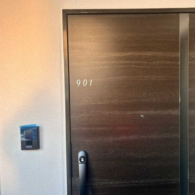 住戸番号は、シンプルで見やすいカッティングシートを使用しています。落ち着いたフォントと上品な色合いを選定し、建物全体の雰囲気を損なうことなく、統一感のあるデザインに仕上げました。今回の施工では、デザインの美しさだけでなく、耐久性や実用性にもこだわり、マンション全体の雰囲気に溶け込むようなサインを製作しました。住まわれる方や訪れる方々に、洗練された印象を与える仕上がりとなっています。