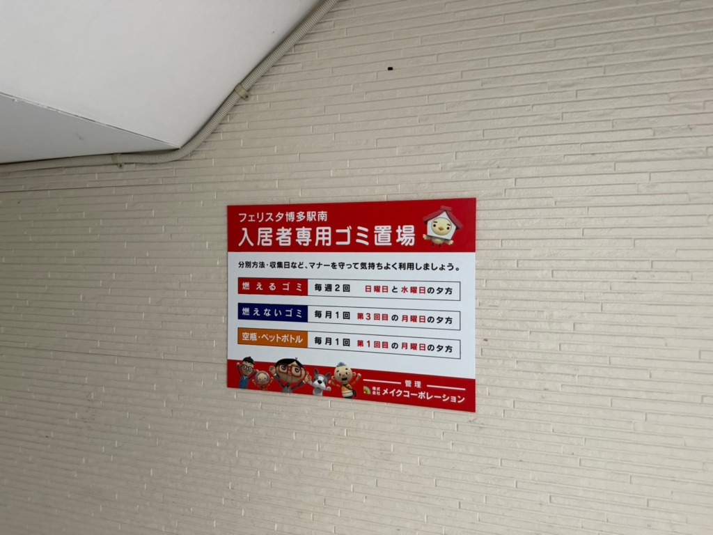 フェリスタ博多駅南様の入居者専用ゴミ置場に設置するゴミ看板を製作しました。看板の素材には、耐久性に優れたアルミ複合板を採用し、表面にはインクジェット出力シートと屋外用UVラミネートを施しました。これにより、屋外での長期使用にも耐え、色褪せや劣化を防ぐ仕様になっています。