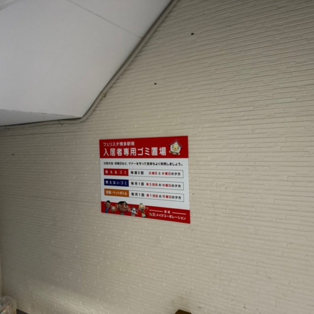 フェリスタ博多駅南様の入居者専用ゴミ置場に設置するゴミ看板を製作しました。看板の素材には、耐久性に優れたアルミ複合板を採用し、表面にはインクジェット出力シートと屋外用UVラミネートを施しました。これにより、屋外での長期使用にも耐え、色褪せや劣化を防ぐ仕様になっています。