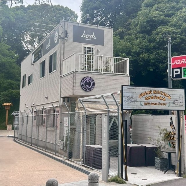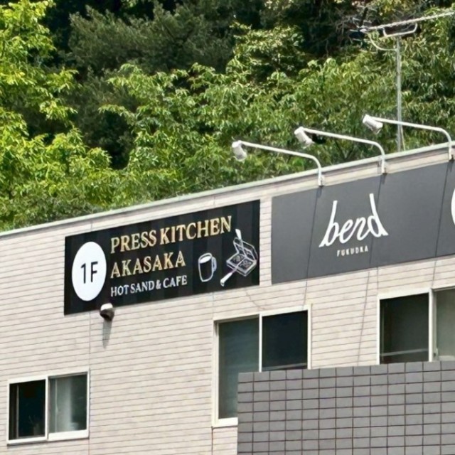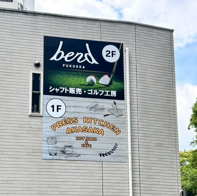 施設北側南側の両面にサインを配置し、店舗名「プレスキッチン」「bend」のロゴが遠方からでも認識しやすくなっています。