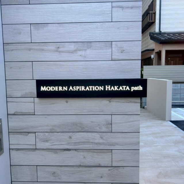 博多区美野島にて、新築物件「MODERN ASPIRATION HAKATA path」の館銘板サインを製作・設置いたしました。施工日は8月1日。