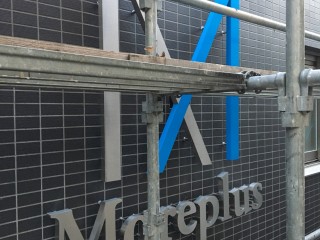 壁面サインのロゴは、ヘアライン加工部と焼付塗装部で分割になっており、夜はバックライトで光ります。下の文字はステンレス箱文字。