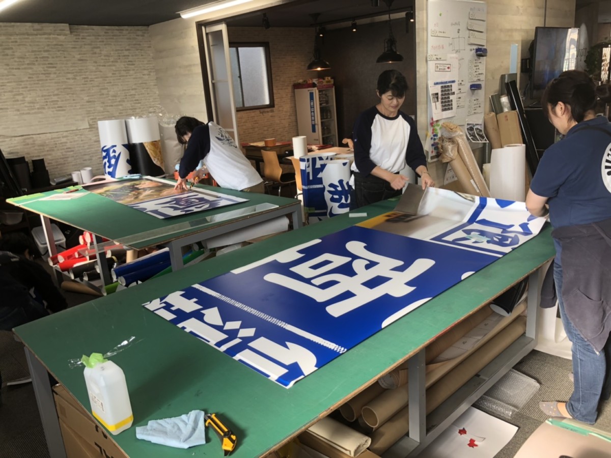 分割して出力、アルミ複合板にシートを貼っていきます。