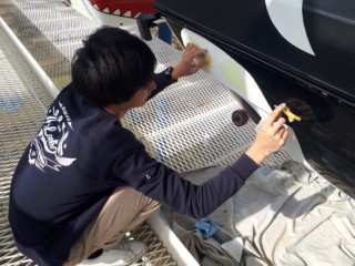 シャチの形をしたジェットコースターに、水しぶきの形に切り抜いた蓄光シートを貼っていきます。