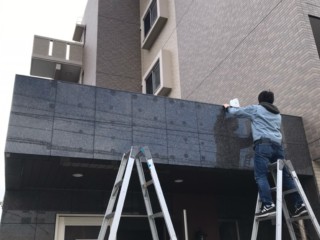 ゴミ置き場の上部にはアルミ複合板にインクジェット出力シートを貼り、施工。
