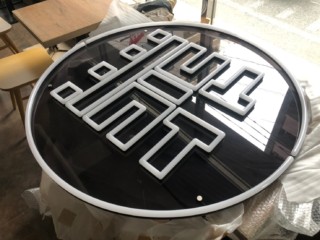 下地に黒スモークのアクリルを準備し、ネオン風樹脂文字を貼り付けています。
