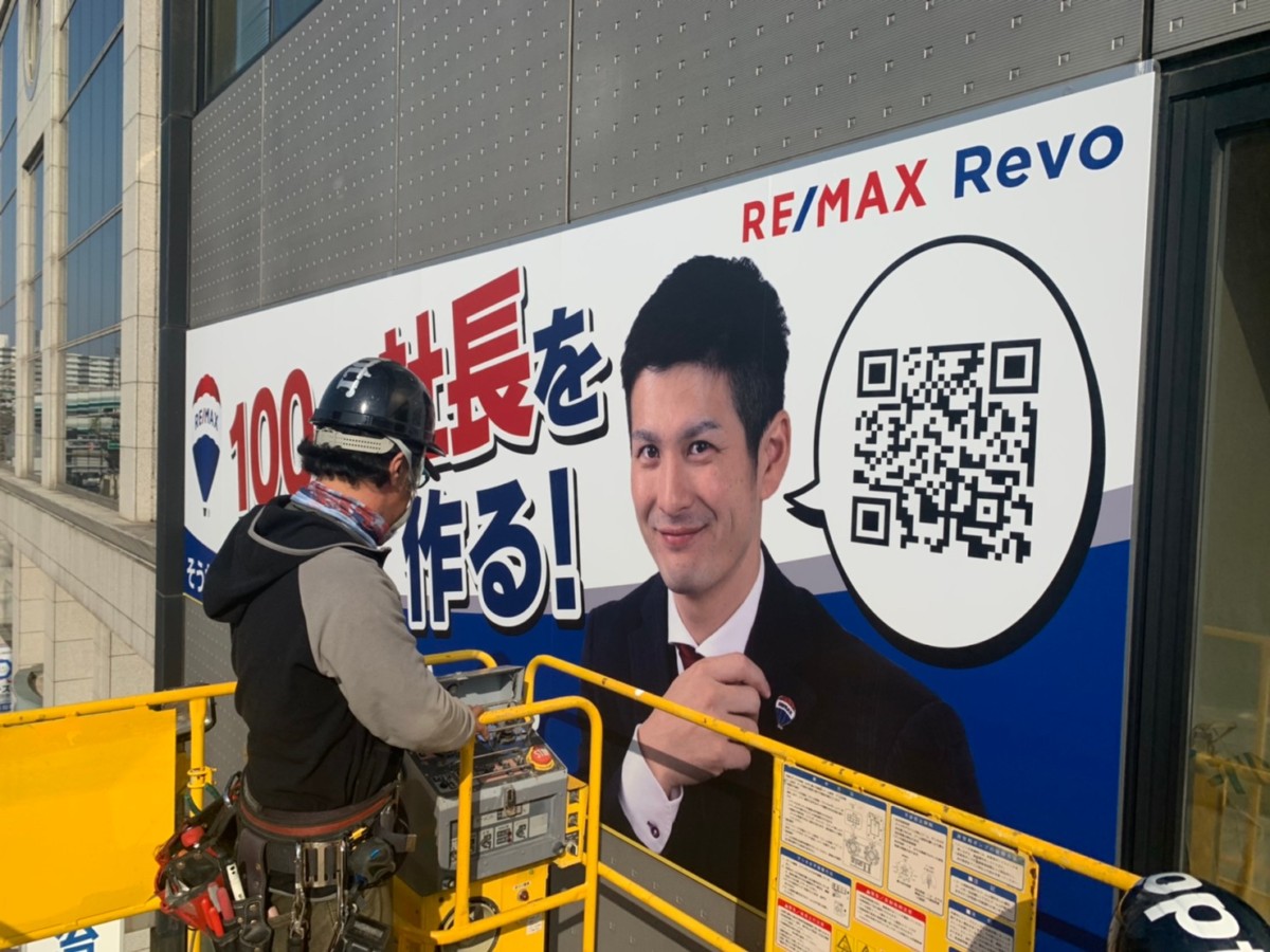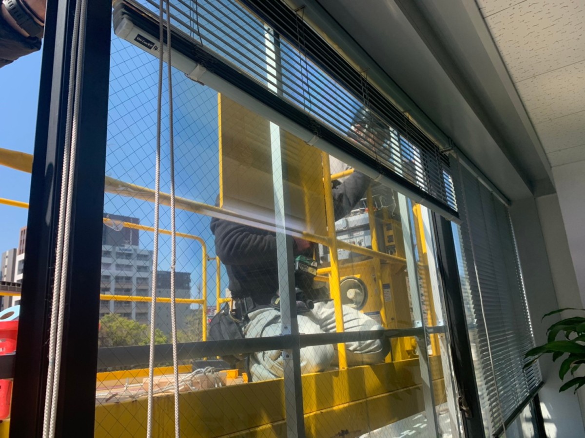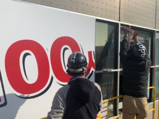 窓に直接貼らず、アルミフレームを組みアルミ複合板にインクジェット出力シートを貼った板を施工します。