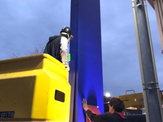 アッパーライトで照らすと、夜でも視認性が高いサインです。
